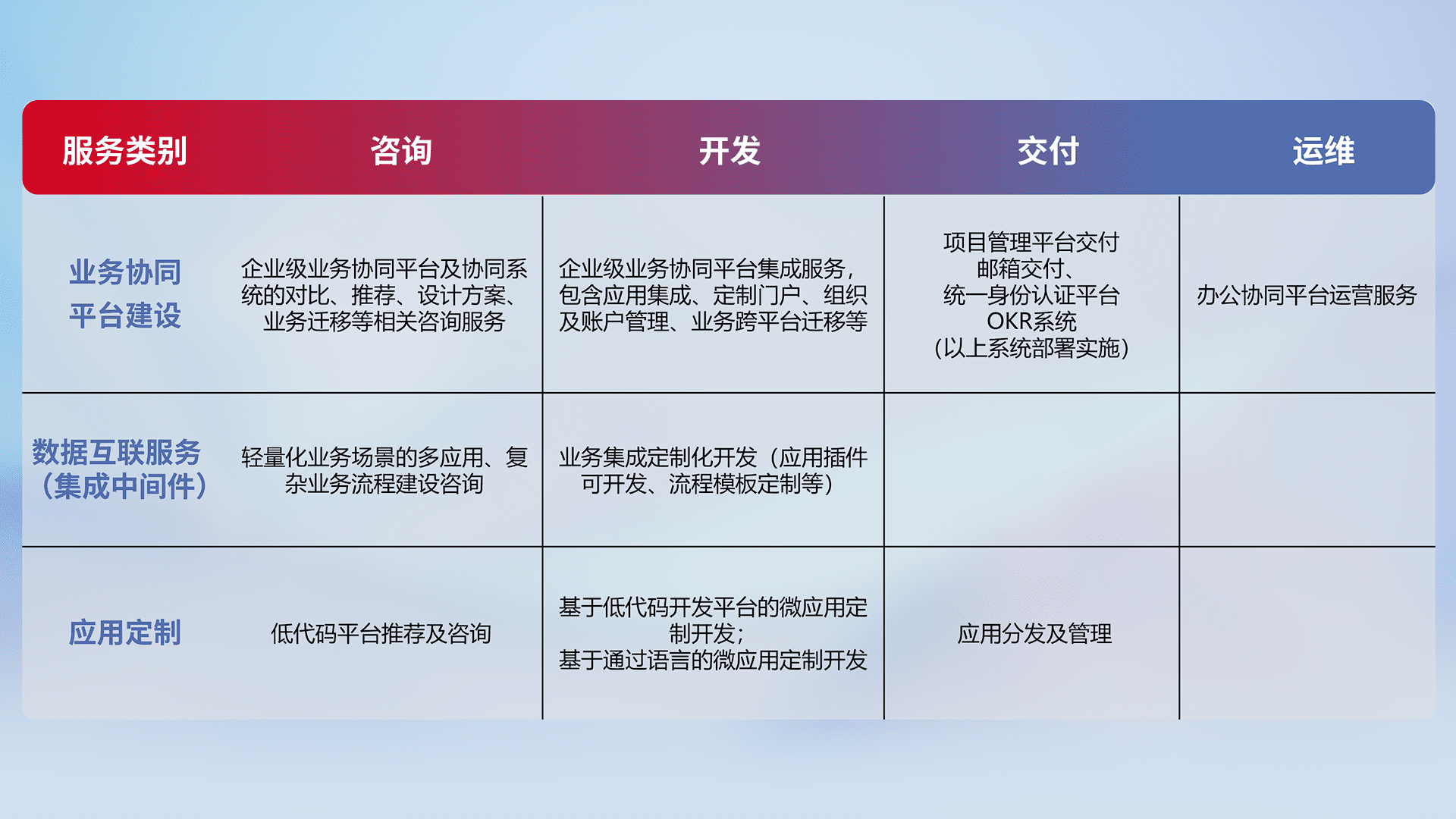 针对钉钉、、企微、、、、IDaas等平台级产品提供产品的规划、、、方案、、交付、、、定制化开发等服务,,实现如统一协同办公、、、、智能客户服务、、、、混合会议管理、、、、智能数据查询、、等业务场景,,,实现数字化转型。。