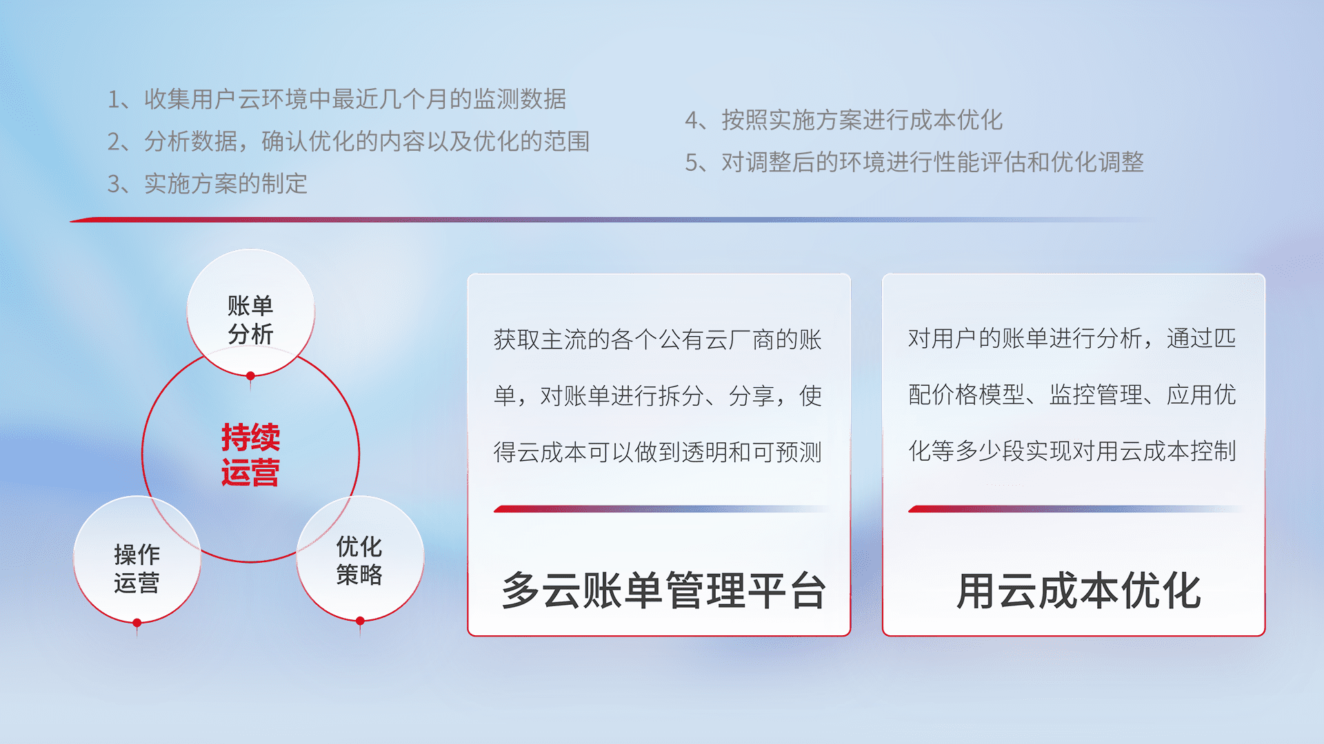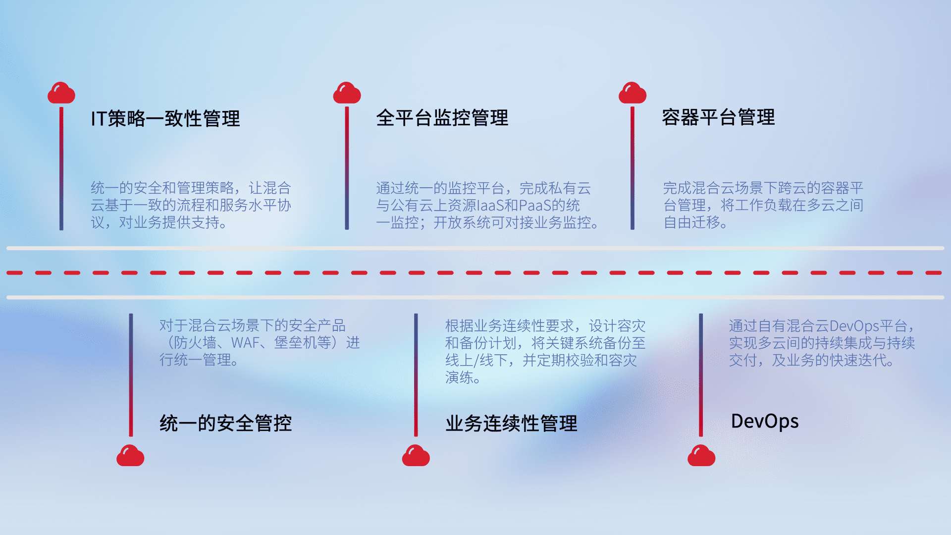 通过多云纳管,,,,以统一的资源数据模型把客户的云资源进行抽象和封装,,进而实现对多云资源的统一操作,,,,保障云资源管理的可靠性、、、、稳定性与可用性。。量身定制化运维内容,,,,配置、、、开发运维、、补丁管理、、、、备份、、、监控、、、、认证和访问管理、、审计和日常巡检等,,保障在用云过程中的可靠度,,,,稳定度以及高可用率。。